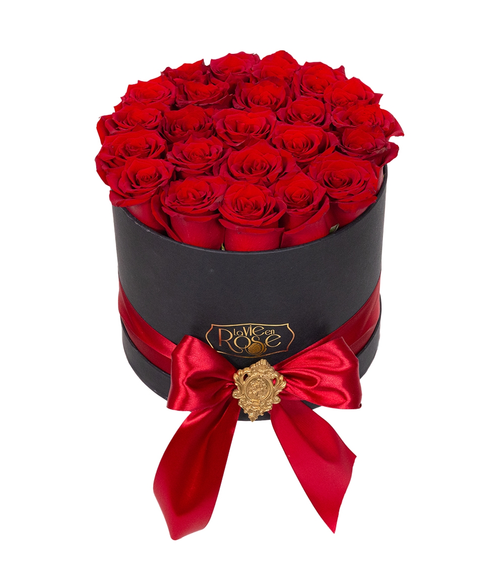 Note Bouquet of Roses in a Box – Classic Love: Category, color or shade of flowers may differ depending on stock availability. The box can be customized according to your preferences. When placing your order, please fill in the “mentions” box if you wish to change the color of the roses or the color of the box (other colors available: white, pink or gold). The box contains 23-25 Red Roses. Box diameter: 25 cm.