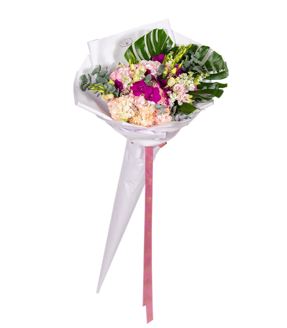 A giant white and pink bouquet is built from monstera, orchids and hydrangeas, along with miniroses, as well as eustoma and eucalyptus. It’s important for us, when thinking about a bouquet, to think about your intention when you offer it. This bouquet says perk, it says celebration, it says love and it’s definitely a memorable gift.