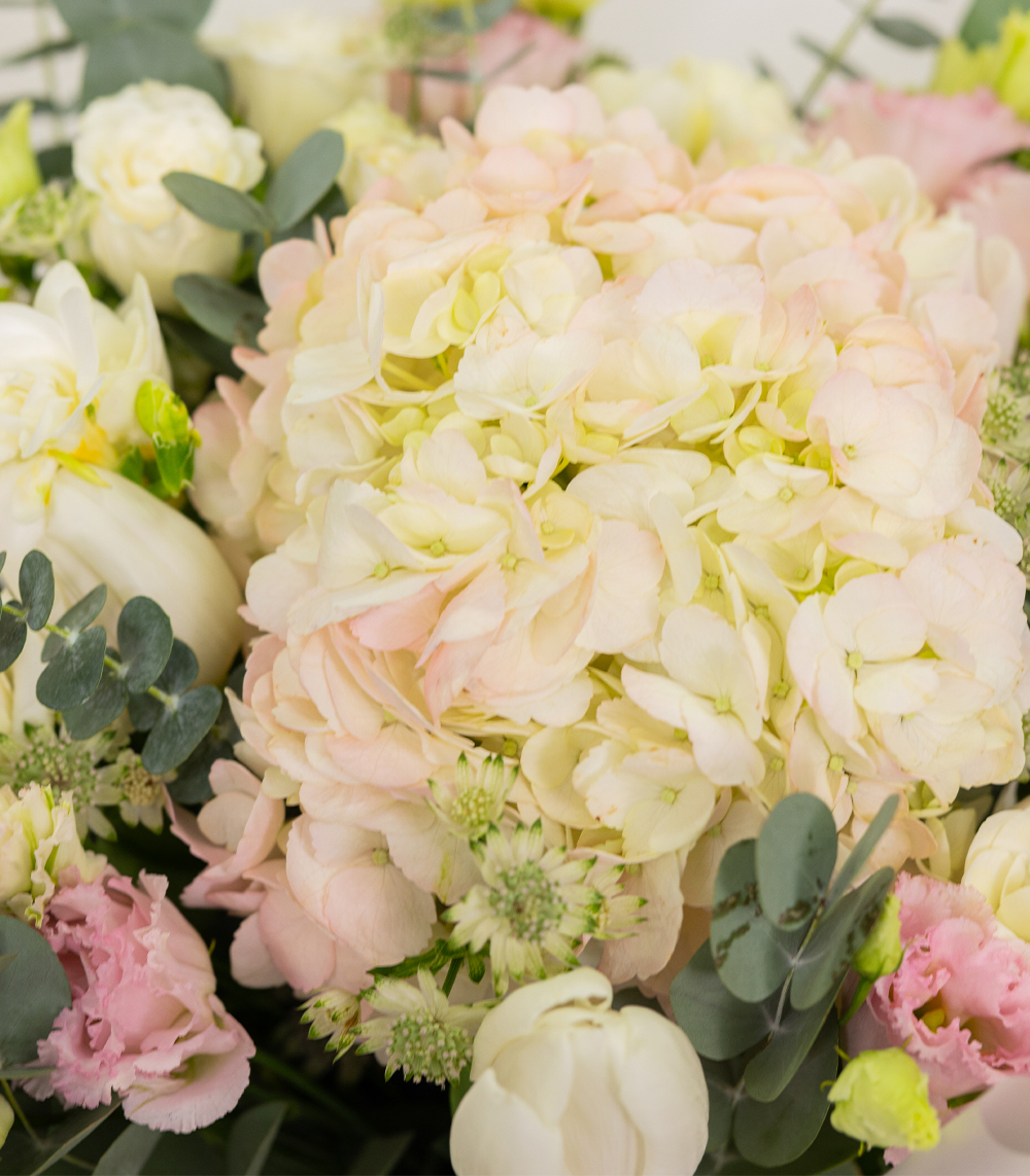 Eucalyptus is a naturally rare color, so its presence in the bouquet adds a special texture to the whole arrangement. While a mix of pastel flowers is a slightly daring gift, it also represents a form of freshness and optimism that we wanted to emulate in this floral combination, both chromatically and texturally.