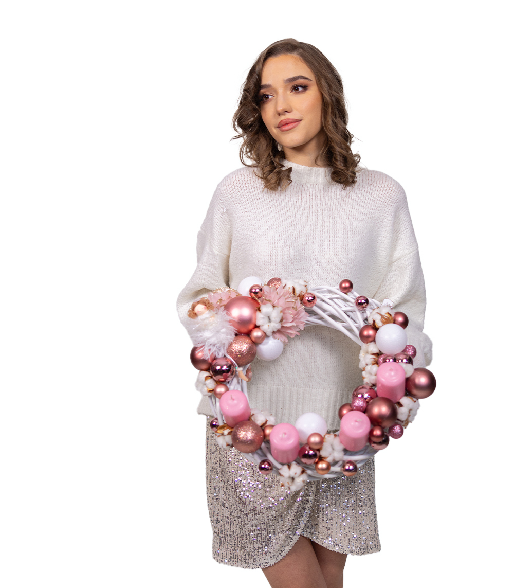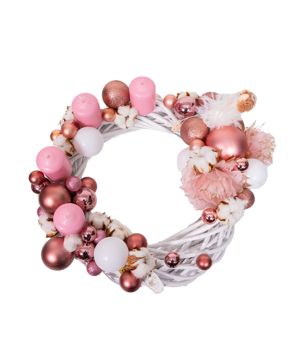 A table wreath is a great gift to give to your loved ones as the cold season arrives. It is very important to mention that while most Christmas ornaments opt for the classic colors associated with such events – red, green or gold in various combinations – we have created this pink table wreath as a table decoration to help you stand out on the Christmas table with a new, modern design that deviates from the classic colors.